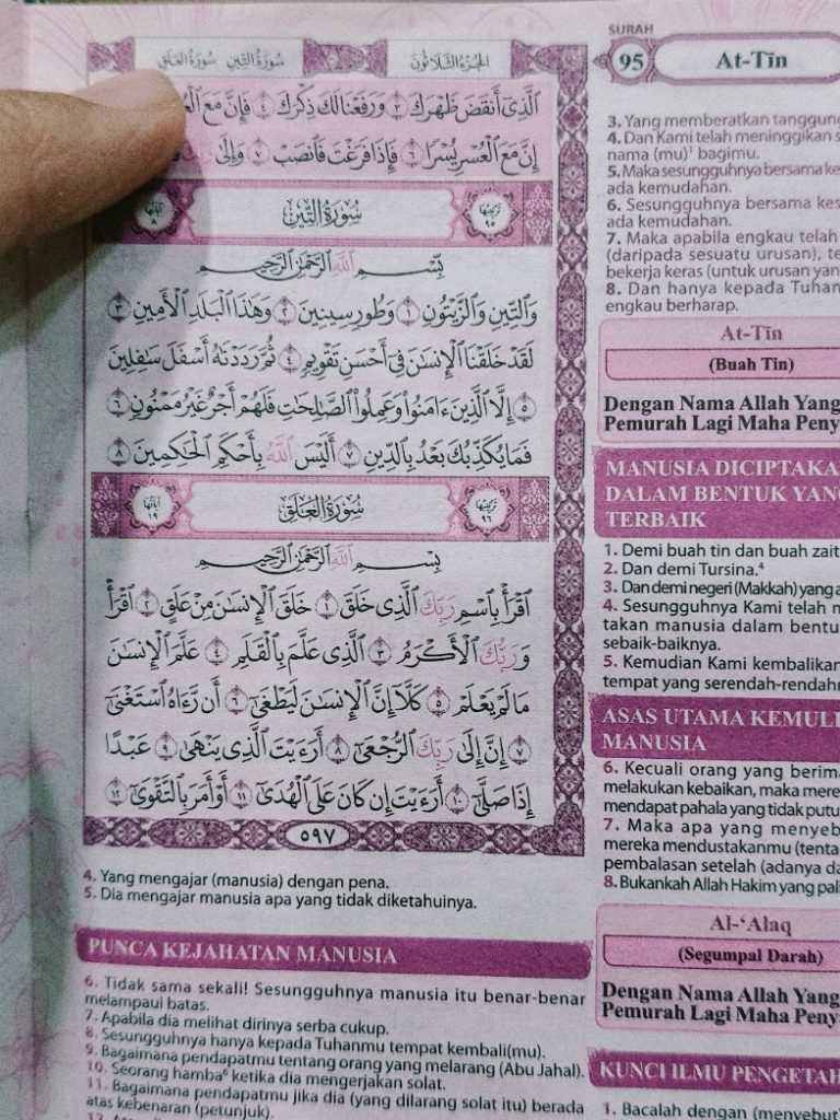 Maksudnya: Bacalah dengan (menyebut) nama Tuhanmu yang menciptakan. Dia menciptakan manusia daripada segumpal darah. Bacalah dan Tuhanmulah Yang Maha Mulia. Yang mengajar (manusia) dengan pena. Dia mengajar manusia apa yang tidak diketahuinya. (Al-Alaq 96: 1-5)