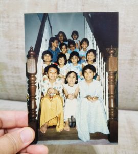 Siap aje bahan masak untuk butter chicken dan saya serahkan bab goreng ayam pada sorang adik saya, saya ke depan kejap. Masa ni mata terus tertangkap wajah yang lama sangat tak berbual panjang dan susah nak jumpa. Jiran merangkap rakan sparring silat saya masa sekolah ada datang dengan familinya. Wah!! Seronok betul kami berborak masa tu. Cerita macam-macam masa tu. Dan nak dijadikan cerita, abah saya boleh pulak dia cetak gambar lama kami semua kecik-kecik bergambar kat tangga berkeping-keping. Dia bagi gambar tu kat famili jiran saya ni. Makin meriah bercerita. Lepas tu, kami berempat + 1 (mewakili abangnya) bergambar kenangan kat tangga rumah kami. Dah comei aje rupa masing-masing.